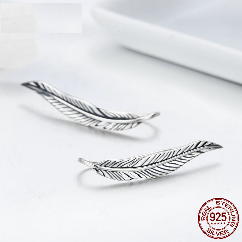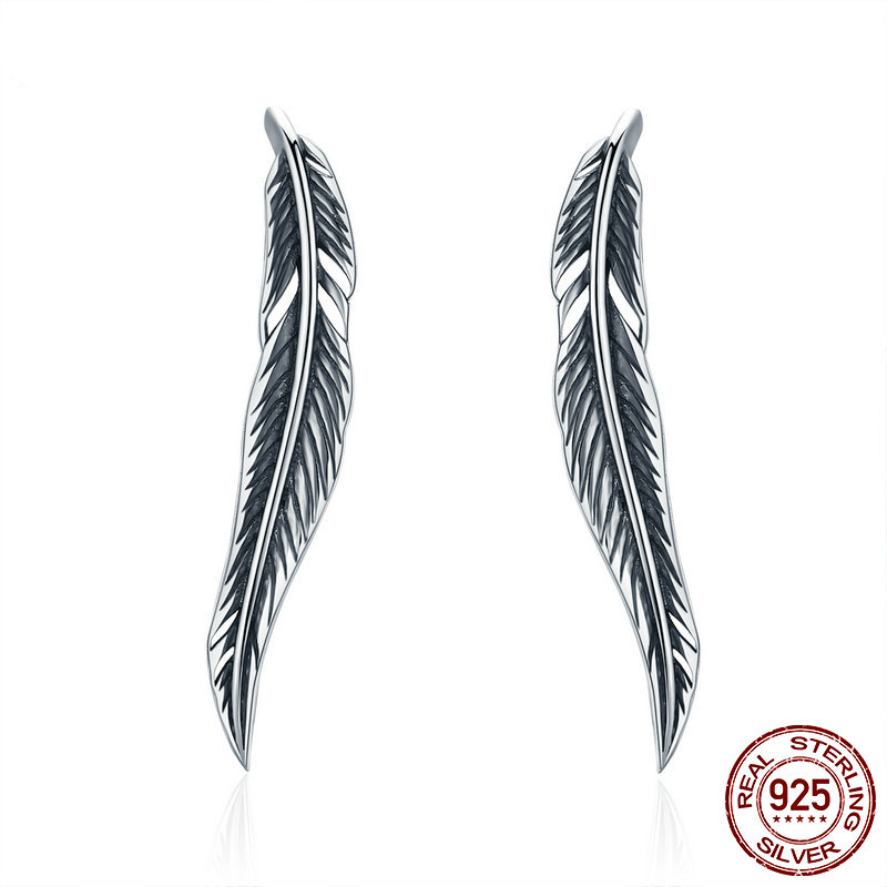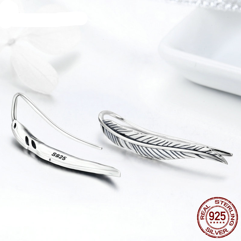 Authentic 925 Sterling Silver Vintage Feather Wings Drop Earrings for Women